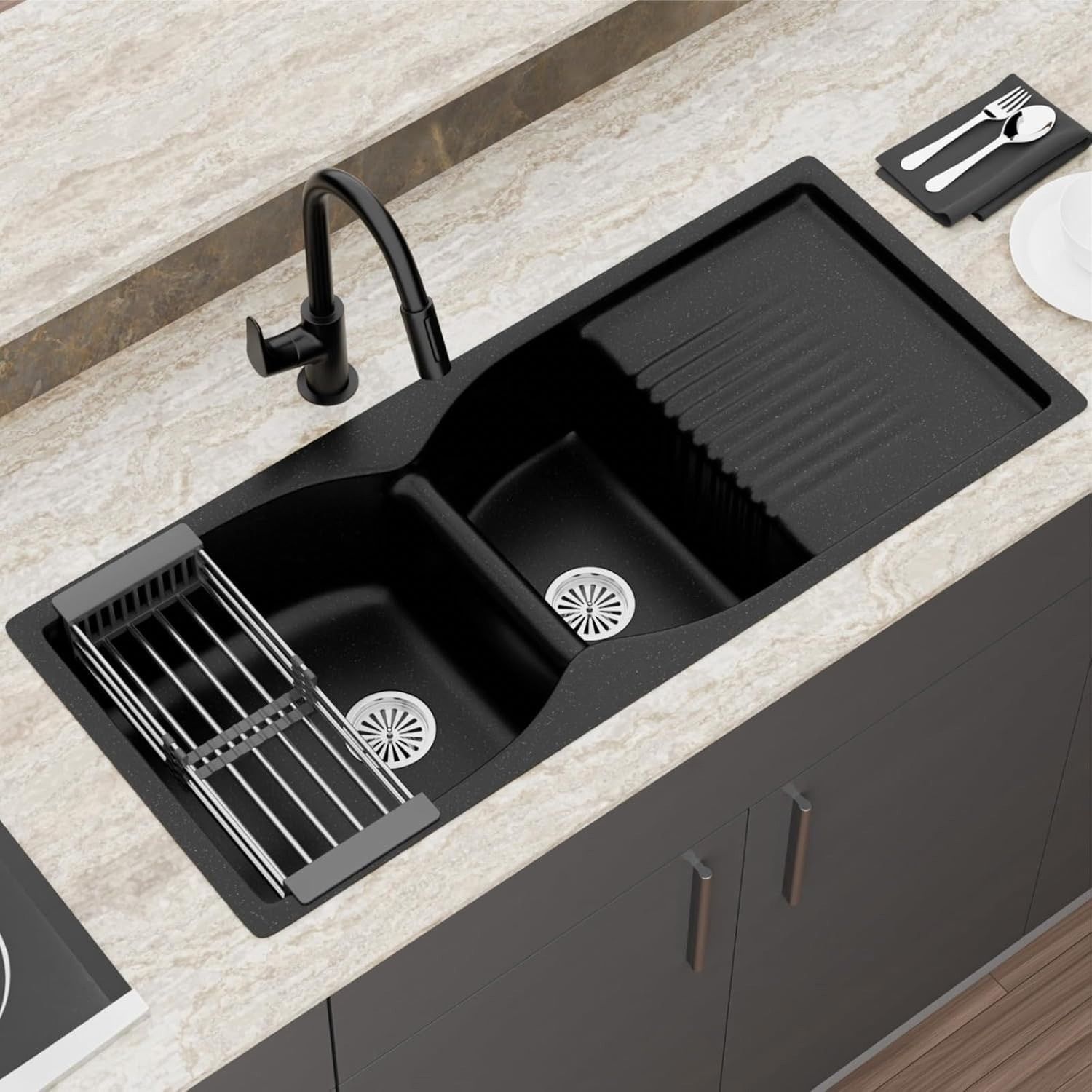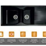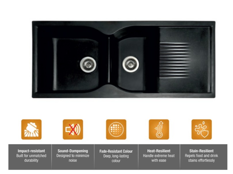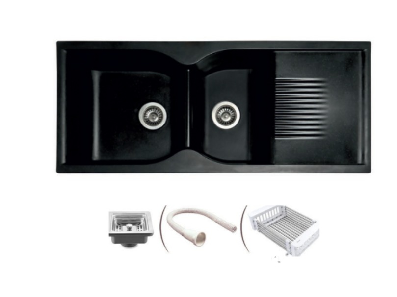 - MATERIAL: Crafted from 12mm thick Quartz and resin, this rectangular single-bowl sink offers durability, hygiene, and a bold Double Bowl with Drain Board Black finish.
